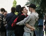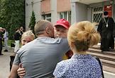 Церемония отправки призывников на срочную службу от военкомата Советского района. Жанровая фотография. Призывники и их родственники во время прощания.