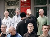 Церемония отправки призывников на срочную службу от военкомата Советского района. Жанровая фотография. Священнослужитель во время обряда благословения.