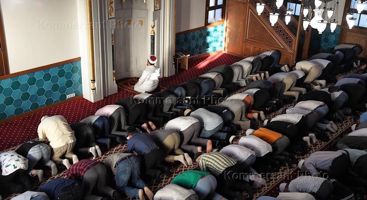 Feast of the Sacrifice of Eid al-Adha in Crimea. Believers pray at the Korbek Jami mosque in the village of Izobilnoye, Alushta city district.