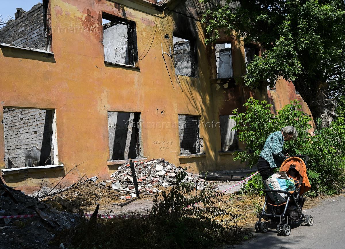 Виды Мариуполя. Жанровая фотография. Пожилая женщина возле разрушенного во время боевых действий жилого дома.