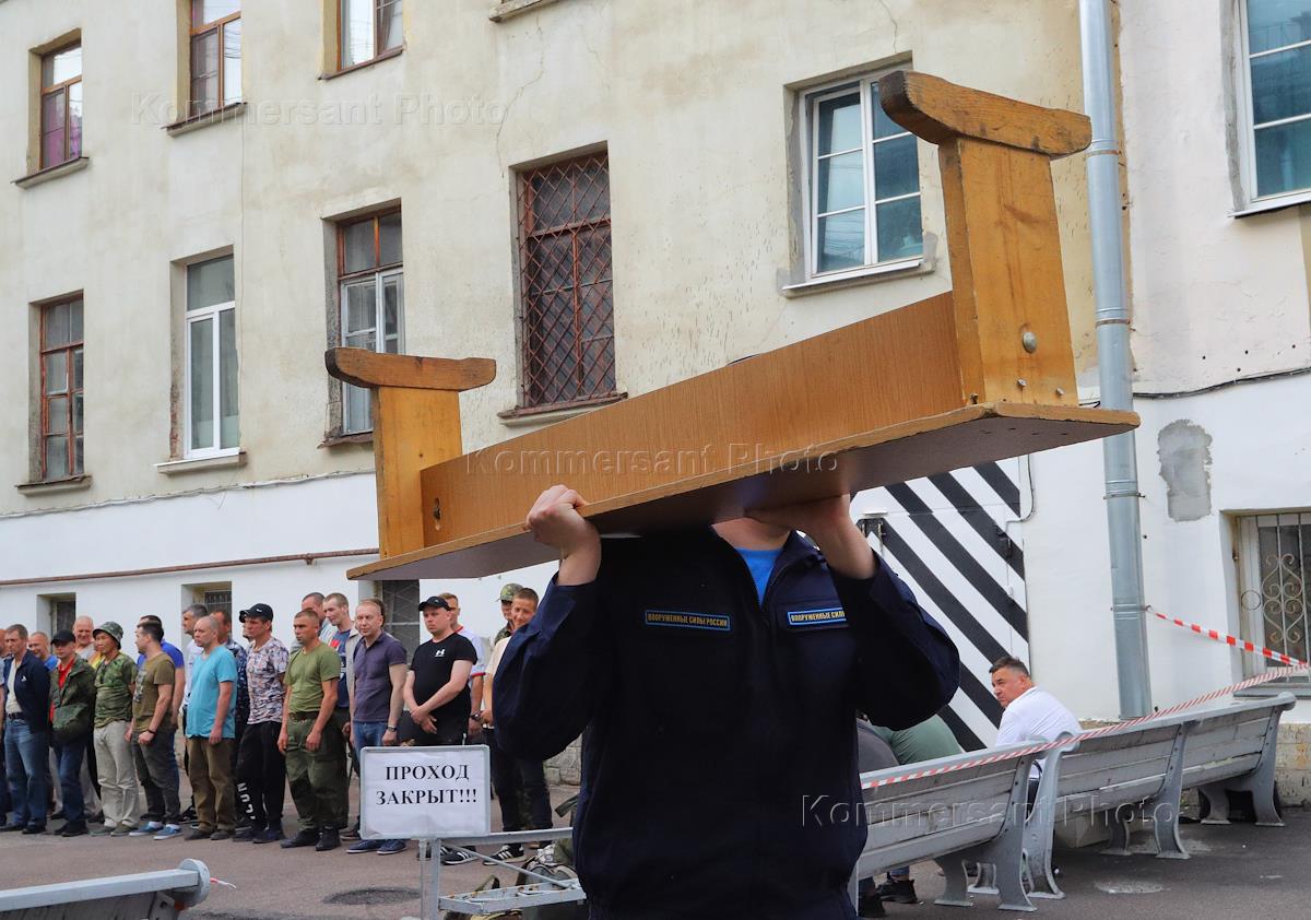 The ceremony of sending volunteers who entered military service under a contract to the places of service from the Leningrad Regional Military Commissariat on the embankment of the Fontanka River.
