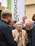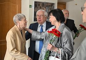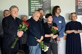 Церемония прощания с одним из основателей партии "Яблоко", соавтором текса Конституции России, Виктором Шейнисом в офисе партии "Яблоко". Вдова политика Виктора Шейниса Алла Назимова (слева) и председатель Псковского регионального отделения партии "Яблоко" Лев Шлосберг (признан в России иноагентом) (в центре) на церемонии.
