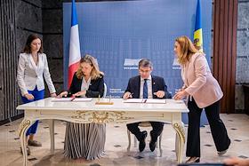 Официальный визит председателя Национального собрания Франции Яэль Браун-Пиве в Республику Молдова. Председатель Национального собрания Франции Яэль Браун-Пиве (вторая слева) и председатель парламента Республики Молдова Игорь Гросу (второй справа) во время церемонии подписания Меморандума о взаимопонимании между парламентами Франции и Молдовы.