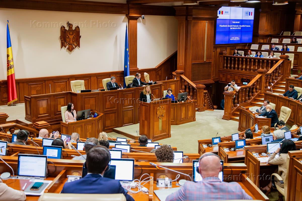 Официальный визит председателя Национального собрания Франции Яэль Браун-Пиве в Республику Молдова. Председатель Национального собрания Франции Яэль Браун-Пиве (в центре) во время выступления на пленарном заседании парламента Молдавии.
