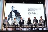 Public talk ("Публичный разговор") "Город нового времени: как создать самодостаточный субцентр" на территории многофункционального комплекса Slava. Слева направо: телеведущий Владимир Познер, директор Государственного музея изобразительных искусств (ГМИИ) имени Пушкина Елизавета Лихачева, основатель бюро Citymakers Петр Кудрявцев, управляющий партнер компании MR Group Мария Чернякова, заместитель председателя ВЭБ.РФ Александр Тарабрин и главный архитектор города Москвы Сергей Кузнецов во время дискуссии.