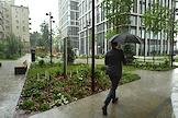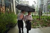 Public talk ("Публичный разговор") "Город нового времени: как создать самодостаточный субцентр" на территории многофункционального комплекса Slava. Жанровая фотография. Официанты несут подносы с едой во время сильного дождя.