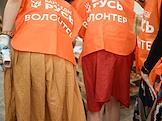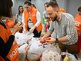День открытых дверей в благотворительном фонде "Банк еды "Русь". Жанровая фотография. Волонтеры во время раздачи пакетов с продуктами и товарами первой необходимости нуждающимся.