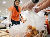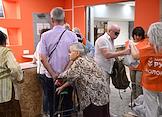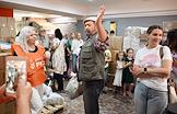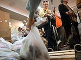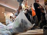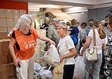 День открытых дверей в благотворительном фонде "Банк еды "Русь". Жанровая фотография. Люди во время получения пакетов с продуктами и товарами первой необходимости.
