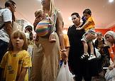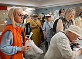 День открытых дверей в благотворительном фонде "Банк еды "Русь". Жанровая фотография. Люди в очереди за продуктами и товарами первой необходимости.