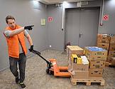 День открытых дверей в благотворительном фонде "Банк еды "Русь". Жанровая фотография. Волонтер во время транспортировки продуктов к месту их дальнейшей упаковки и отправки нуждающимся.