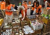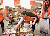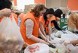 День открытых дверей в благотворительном фонде "Банк еды "Русь". Жанровая фотография. Волонтеры во время упаковки продуктов и товаров первой необходимости по пакетам для дальнейшей отправки нуждающимся.