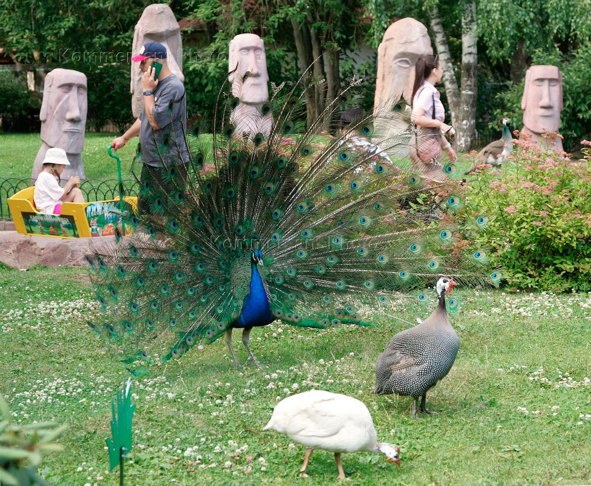 Церемония открытия новой экспозиции "Ирбис" и музея самоваров в зоопарке "Лимпопо". Жанровая фотография. Павлины на территории зоопарка.