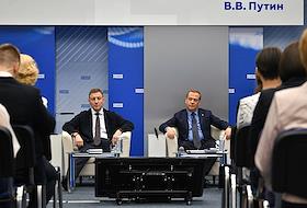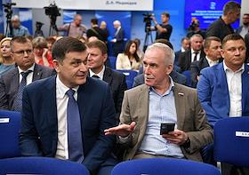 Заседание Президиума Генерального совета политической партии "Единая России" в Центральном исполнительном комитете партии. Губернатор Калужской области Владислав Шапша (слева) и губернатор Севастополя Михаил Развожаев (справа) во время заседания.