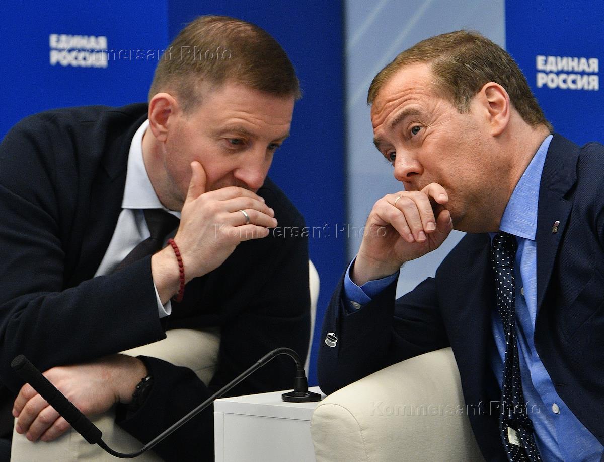 Заседание Президиума Генерального совета политической партии "Единая России" в Центральном исполнительном комитете партии. Заместитель председателя Совета Федерации России, секретарь Генсовета партии "Единая Россия" Андрей Турчак (слева) и заместитель председателя Совета Безопасности России Дмитрий Медведев (справа) во время заседания.