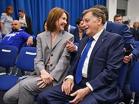 Заседание Президиума Генерального совета политической партии "Единая России" в Центральном исполнительном комитете партии. Член комитета Государственной думы (ГД) России по финансовому рынку Вячеслав Макаров (справа) и первый заместитель председателя комитета ГД России по просвещению Алена Аршинова (слева) во время заседания.