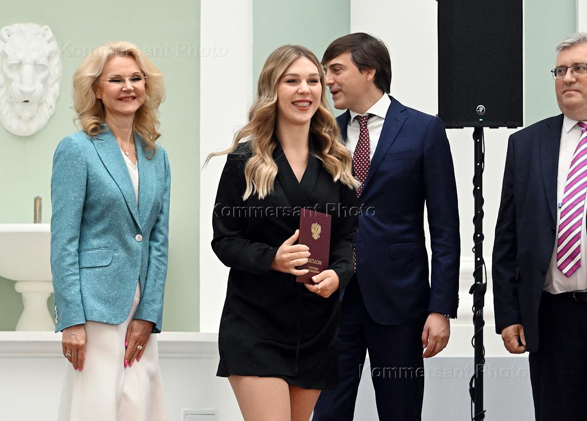 Церемония вручения дипломов с отличием выпускникам российских педагогических вузов в Московском педагогическом государственном университете (МПГУ). Заместитель председателя правительства России Татьяна Голикова (слева), министр просвещения России Сергей Кравцов (второй справа) и ректор Московского педагогического государственного университета Алексей Лубков (справа) во время церемонии.
