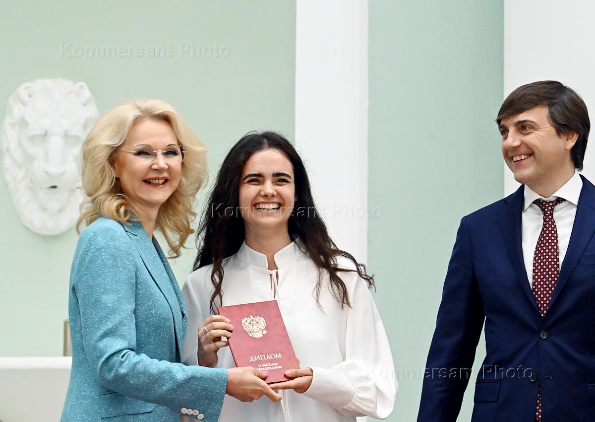 Церемония вручения дипломов с отличием выпускникам российских педагогических вузов в Московском педагогическом государственном университете (МПГУ). Заместитель председателя правительства России Татьяна Голикова (слева) и министр просвещения России Сергей Кравцов (справа) во время церемонии.