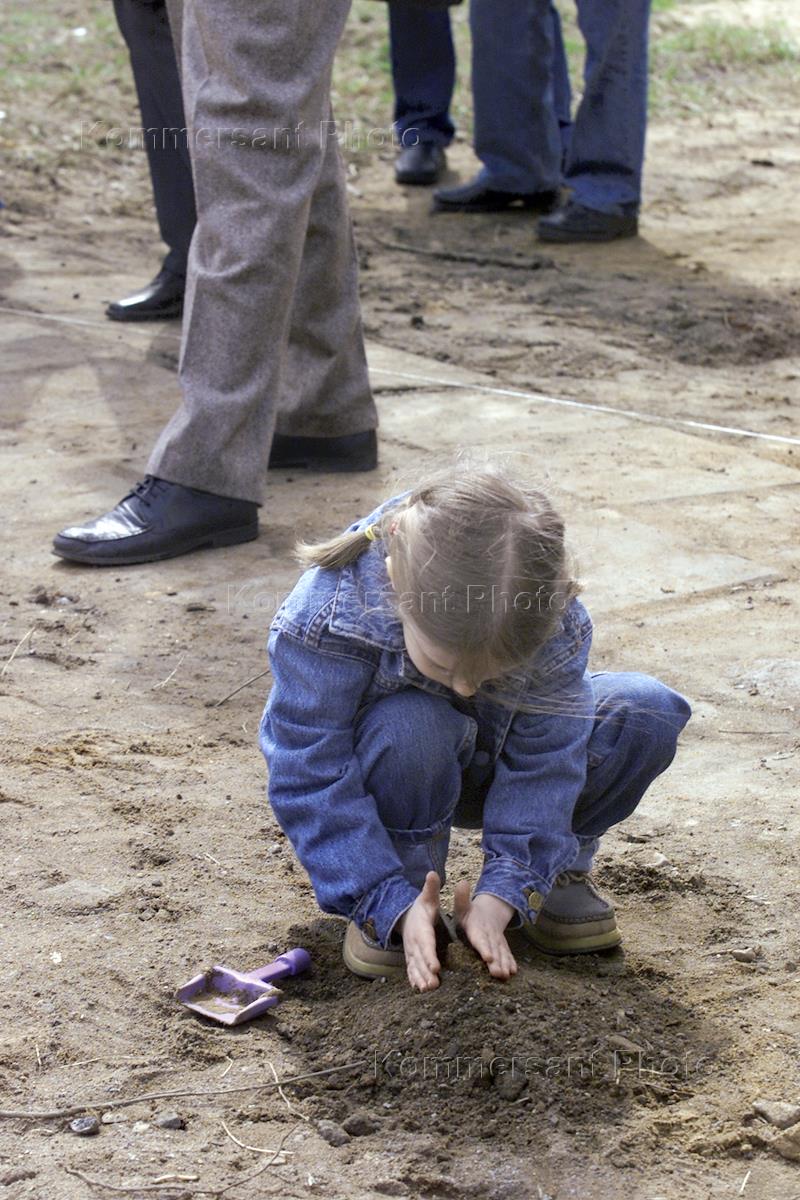 Campaign on reconstruction of the Cherry garden in the K.S. Stanislavsky "Lubimovka" manor. The event was held in the framework of the III World theatre Olympiad and the IV International A.P. Chekhov theatre festival. The girl is building "mud pies".