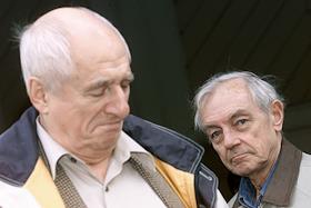 Lenkom Theater Art Director Mark Zakharov (left) and Tovstonogov Bolshoi Drama Theater Art Director Kirill Lavrov (right) take part in the action of rebirth of a cherry orchard at the manor of K. Stanislavsky 'Lyubimovka'. The action took place in the framework of the III World Theater Olympiad at the IV Chekhov World Theater Festival.