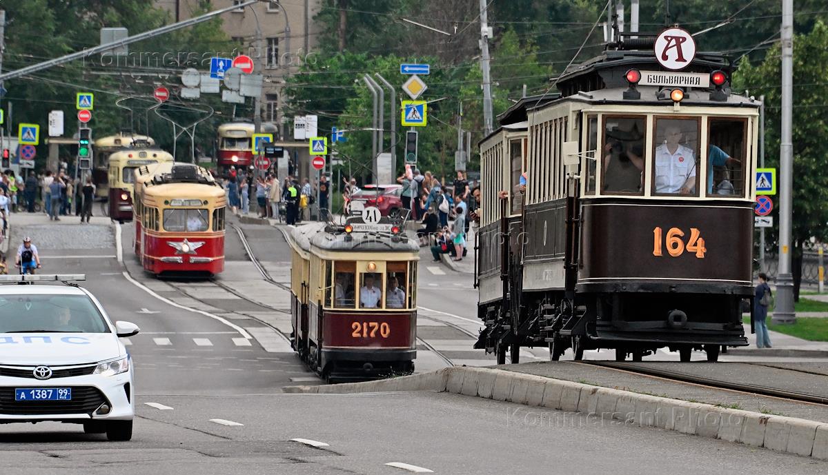 День московского транспорта. Традиционный парад ретротранспорта. Исторические трамваи во время парада.