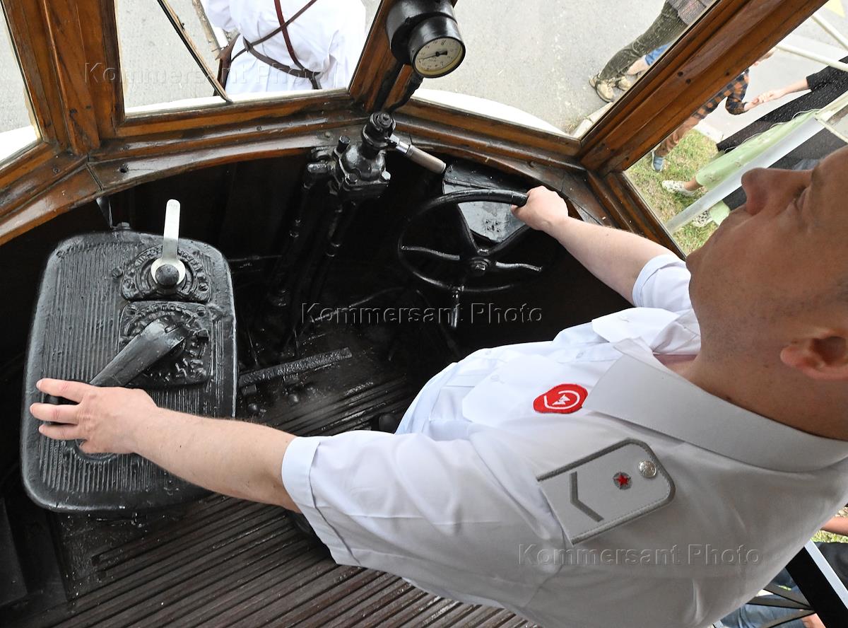 День московского транспорта. Традиционный парад ретротранспорта. Водитель в водительской кабине исторического трамвая во время парада.