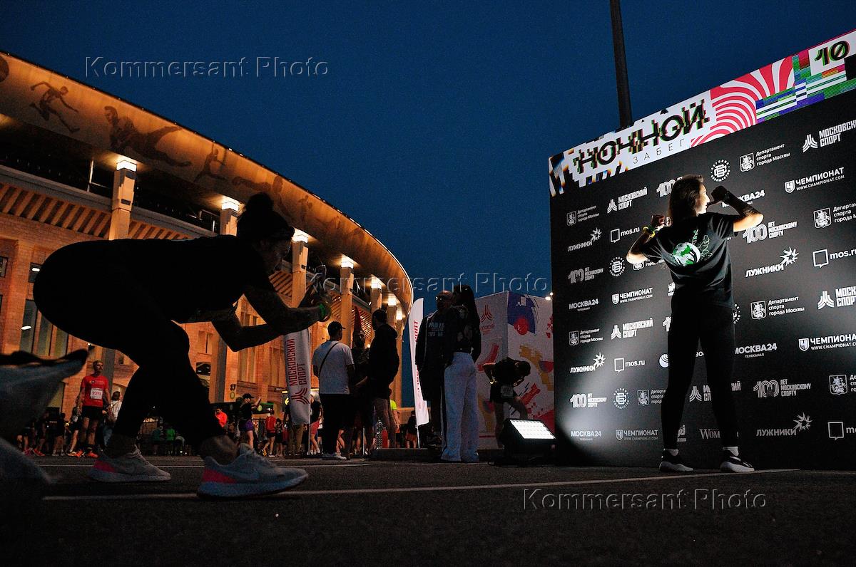 "Ночной забег" на территории Олимпийского комплекса "Лужники". Участники забега во время разминки перед стартом.