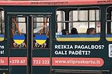 Виды Вильнюса перед саммитом Североатлантического альянса "NATO Public Forum 2023" (НАТО). Жанровая фотография. Надпись в поддержку Украины на информационном табло автобуса.