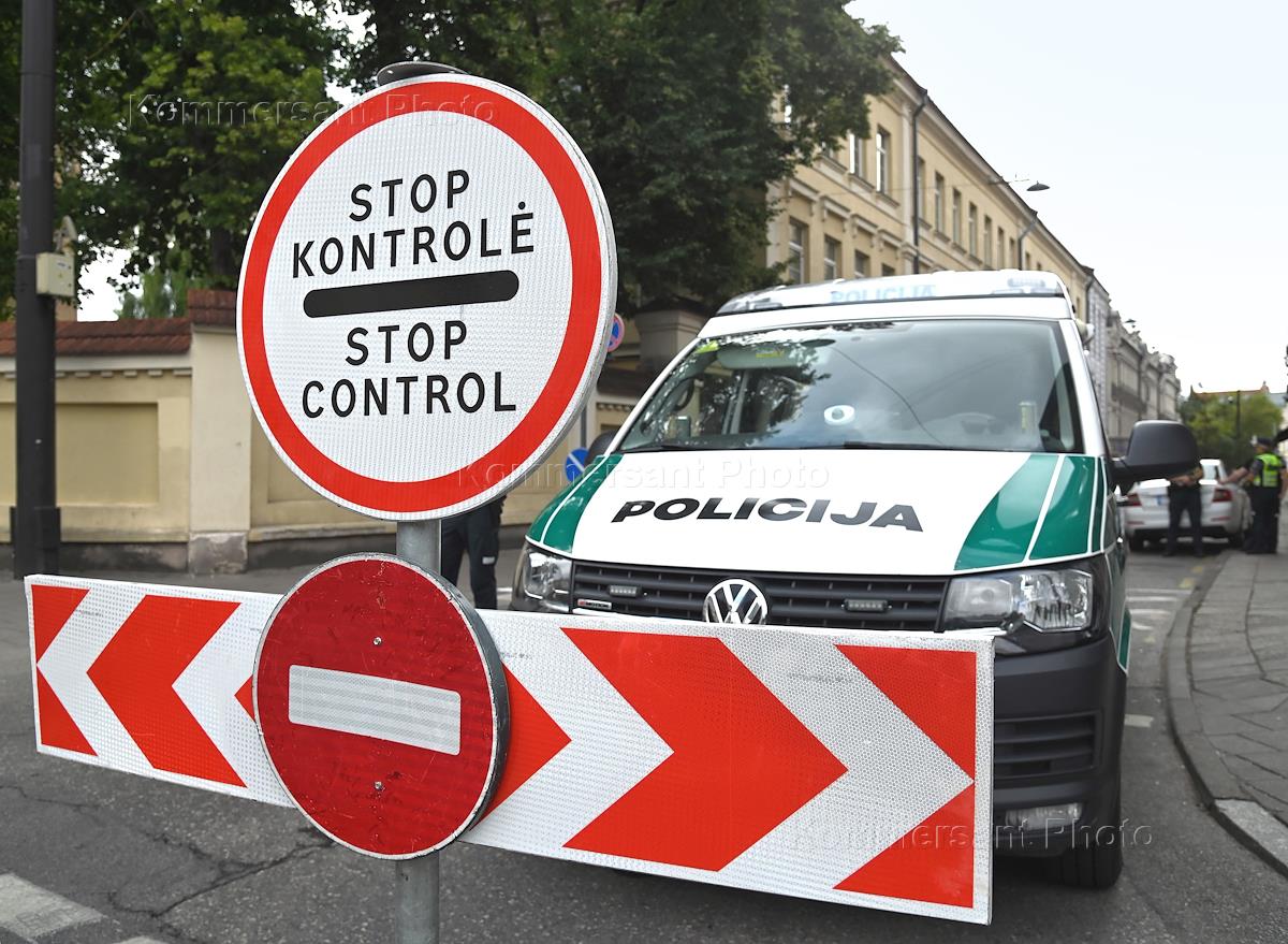 Виды Вильнюса перед саммитом Североатлантического альянса "NATO Public Forum 2023" (НАТО). Жанровая фотография. Дорожные знаки "Запрет проезда на транспорте" и "Стоп. Контроль" на фоне полицейского автомобиля.