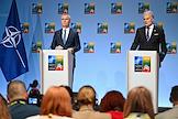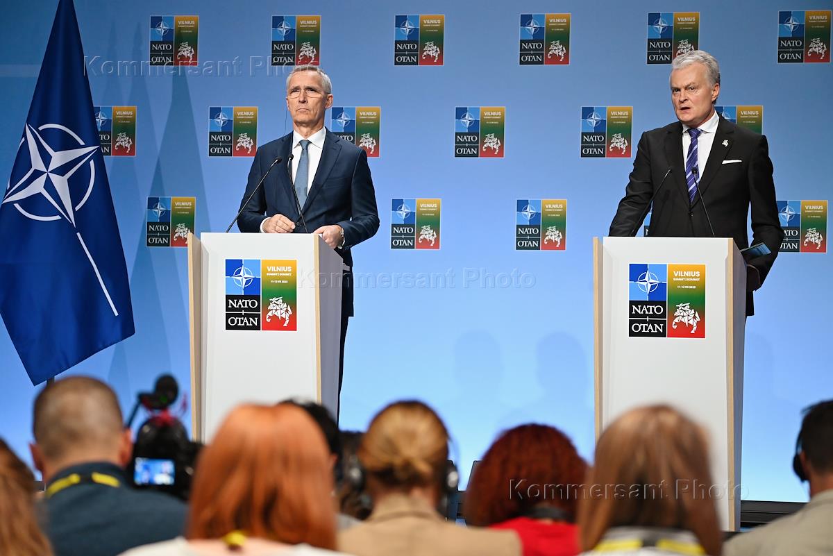 Подготовка к саммиту НАТО (Nato Public Forum 2023) в Вильнюсе. Генеральный секретарь НАТО Йенс Столтенберг (слева) и президент Литвы Гитанас Науседа (справа) во время совместной пресс-конференции на территории Литовского выставочного и конгресс-центра LITEXPO.
