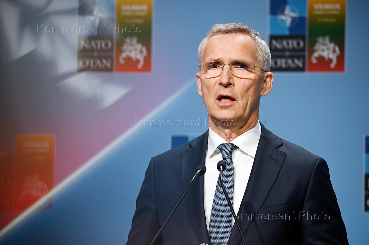 Подготовка к саммиту НАТО (Nato Public Forum 2023) в Вильнюсе. Генеральный секретарь НАТО Йенс Столтенберг во время совместной с президентом Литвы Гитанасом Науседой пресс-конференции на территории Литовского выставочного и конгресс-центра LITEXPO.