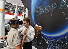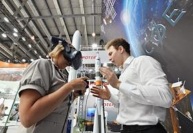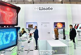 Рабочая поездка председателя правительства России Михаила Мишустина в Екатеринбург. Международная промышленная выставка "Иннопром-2023" (INNOPROM) в Международном выставочном центре (МВЦ) "Екатеринбург-Экспо". Жанровая фотография. Посетители у стенда компании "Швабе".