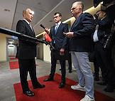 Форум будущих технологий в Центре международной торговли (ЦМТ). Справа налево: генеральный директор госкорпорации "Росатом" Алексей Лихачев, президент России Владимир Путин и генеральный директор Российского квантового центра Руслан Юнусов во время осмотра выставки передовых разработок в области квантовых технологий госкорпорации "Росатом" и ОАО "РЖД".