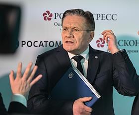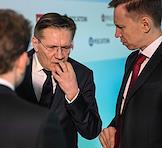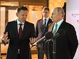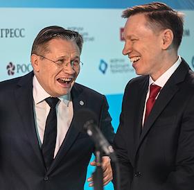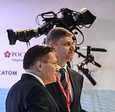 Форум будущих технологий в Центре международной торговли (ЦМТ). Генеральный директор госкорпорации "Росатом" Алексей Лихачев (слева) и генеральный директор - председатель правления ОАО "РЖД" Олег Белозеров (справа) во время осмотра выставки передовых разработок в области квантовых технологий госкорпорации "Росатом" и ОАО "РЖД".