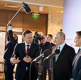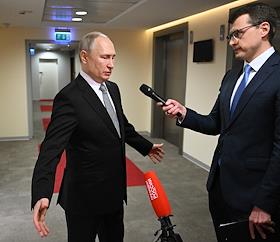 Форум будущих технологий в Центре международной торговли (ЦМТ). Президент России Владимир Путин (слева) и политический обозреватель ВГТРК Павел Зарубин (справа) на форуме.