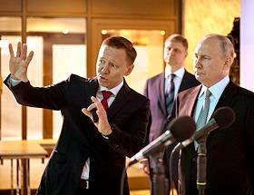 Форум будущих технологий в Центре международной торговли (ЦМТ). Президент России Владимир Путин (в центре) и генеральный директор - председатель правления ОАО "РЖД" Олег Белозеров (справа) во время осмотра выставки передовых разработок в области квантовых технологий госкорпорации "Росатом" и ОАО "РЖД".