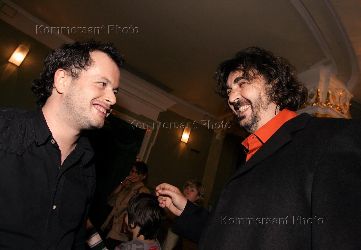Репетиция оперы "Евгений Онегин" композитора Петра Чайковского - режиссер Дмитрий Черников - на новой сцене Государственного академического Большого Театра (ГАБТ). Режиссер Дмитрий Черняков (слева) и актер Игорь Золотовицкий (справа) перед началом репетиции.