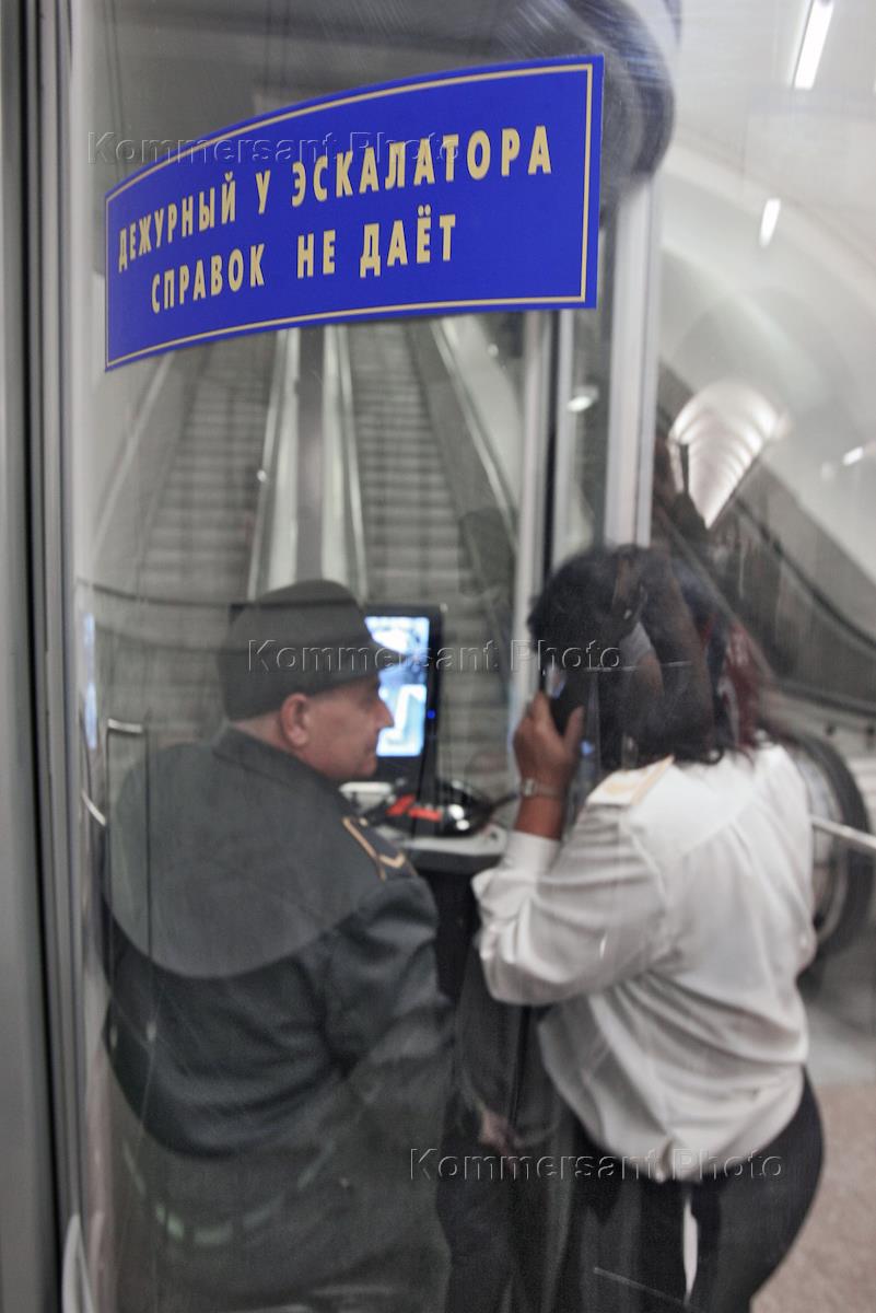 Дежурный у эскалатора на новой станции "Международная" московского метрополитена.