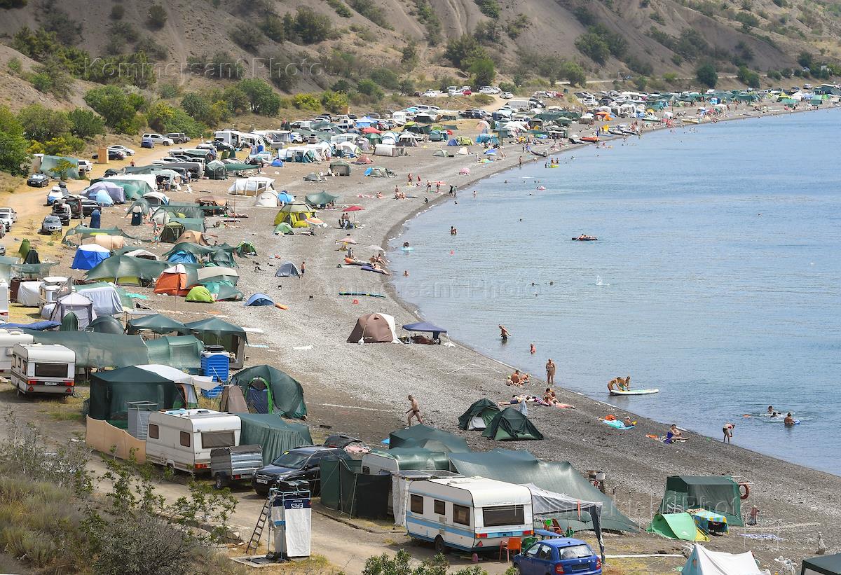 Виды Крыма. Жанровая фотография. Отдыхающие на не оборудованных пляжах на Черном море. Палаточный городок на берегу.