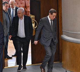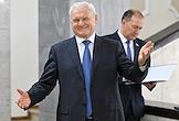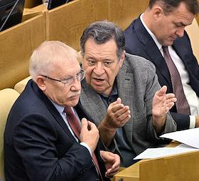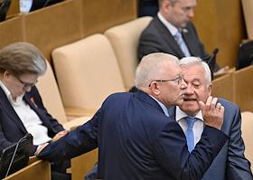 Пленарное заседание Государственной думы (ГД) России. Председатель комитета ГД России по контролю Олег Морозов (в центре) и член комитета ГД России по контролю Леонид Ивлев (справа) перед началом заседания.