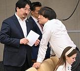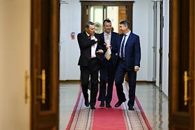 Пленарное заседание Государственной думы (ГД) России. Первый заместитель председателя комитета ГД России по аграрным вопросам Владимир Плотников (второй слева) и первый заместитель председателя комитета ГД России по финансовому рынку Константин Бахарев (в центре) перед началом заседания.