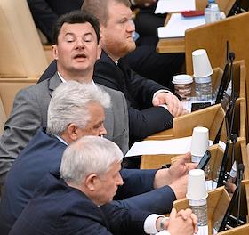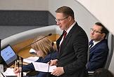 Пленарное заседание Государственной думы (ГД) России. Заместитель председателя комитета ГД России по физической культуре и спорту Сергей Бурлаков (справа) во время заседания.
