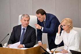 Пленарное заседание Государственной думы (ГД) России. Министр здравоохранения России Михаил Мурашко (в центре) на заседании.