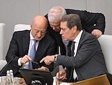 Пленарное заседание Государственной думы (ГД) России. Слева направо: заместитель председателя ГД России Александр Бабаков, председатель комитета ГД России по финансовому рынку Анатолий Аксаков и первый заместитель председателя ГД России Александр Жуков перед началом заседания.