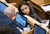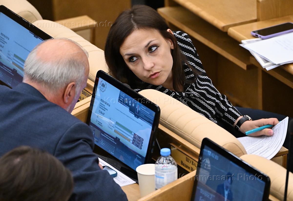 Пленарное заседание Государственной думы (ГД) России. Член комитета ГД России по труду, социальной политике и делам ветеранов Виктория Родина (справа) во время заседания.