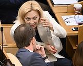 Пленарное заседание Государственной думы (ГД) России. Первый заместитель председателя комитета ГД России по экологии, природным ресурсам и охране окружающей среды Владимир Бурматов (слева) и председатель комитета ГД России по развитию гражданского общества, вопросам общественных и религиозных объединений Ольга Тимофеева (справа) перед началом заседания.