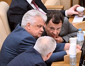 Пленарное заседание Государственной думы (ГД) России. Первый заместитель председателя комитета ГД России по аграрным вопросам Владимир Плотников (слева) перед началом заседания.