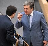 Пленарное заседание Государственной думы (ГД) России. Председатель комитета ГД России по охране здоровья Бадма Башанкаев (слева) и председатель комитета ГД Росси по туризму и развитию туристической инфраструктуры Сангаджи Тарбаев (справа) перед началом заседания.