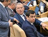 Пленарное заседание Государственной думы (ГД) России. Член комитета ГД по транспорту и строительству Мурад Гаджиев (справа) и член комитета ГД России по энергетике Джамаладин Гасанов (слева) во время заседания.