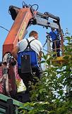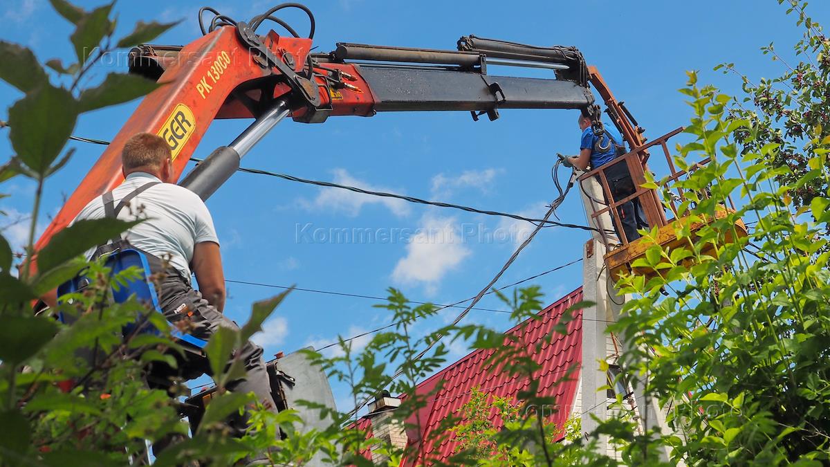 Жанровая фотография. Электрик в рабочей люльке на автоподъемнике Palfinger монтирует на столбе провода линии электроснабжения домов дачного поселка в Всеволожском районе в поселке Васкелово, платформа 54 км.
