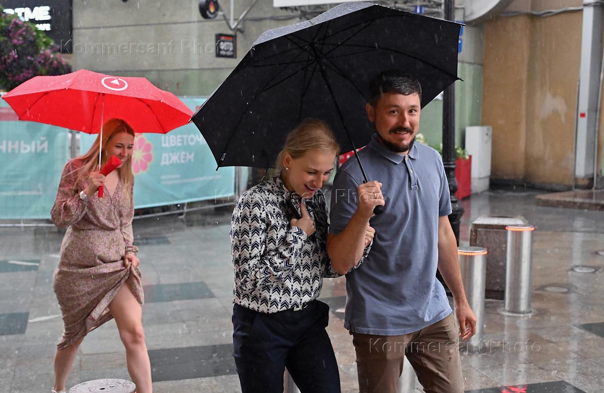 Последствия ливня в Москве. Жанровая фотография. Люди под зонтом.